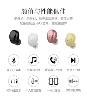Functional highlights: Miniature invisible wearing, Ultra-long standby time, Powerful sound quality, Next song, Volume adjustment, Last digit redial, Incoming call answering and rejection, Incoming call number display, Voice control, One-to-two